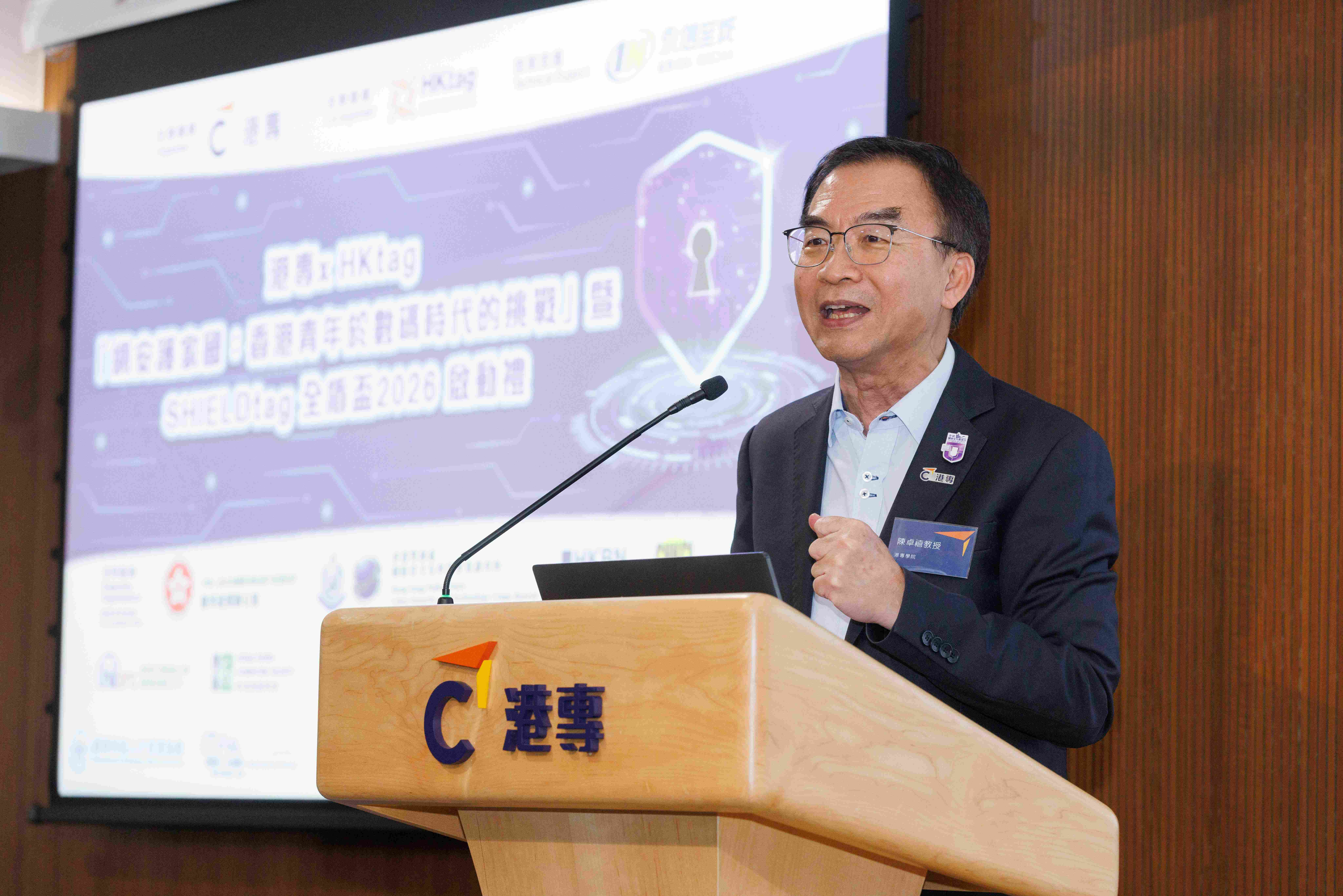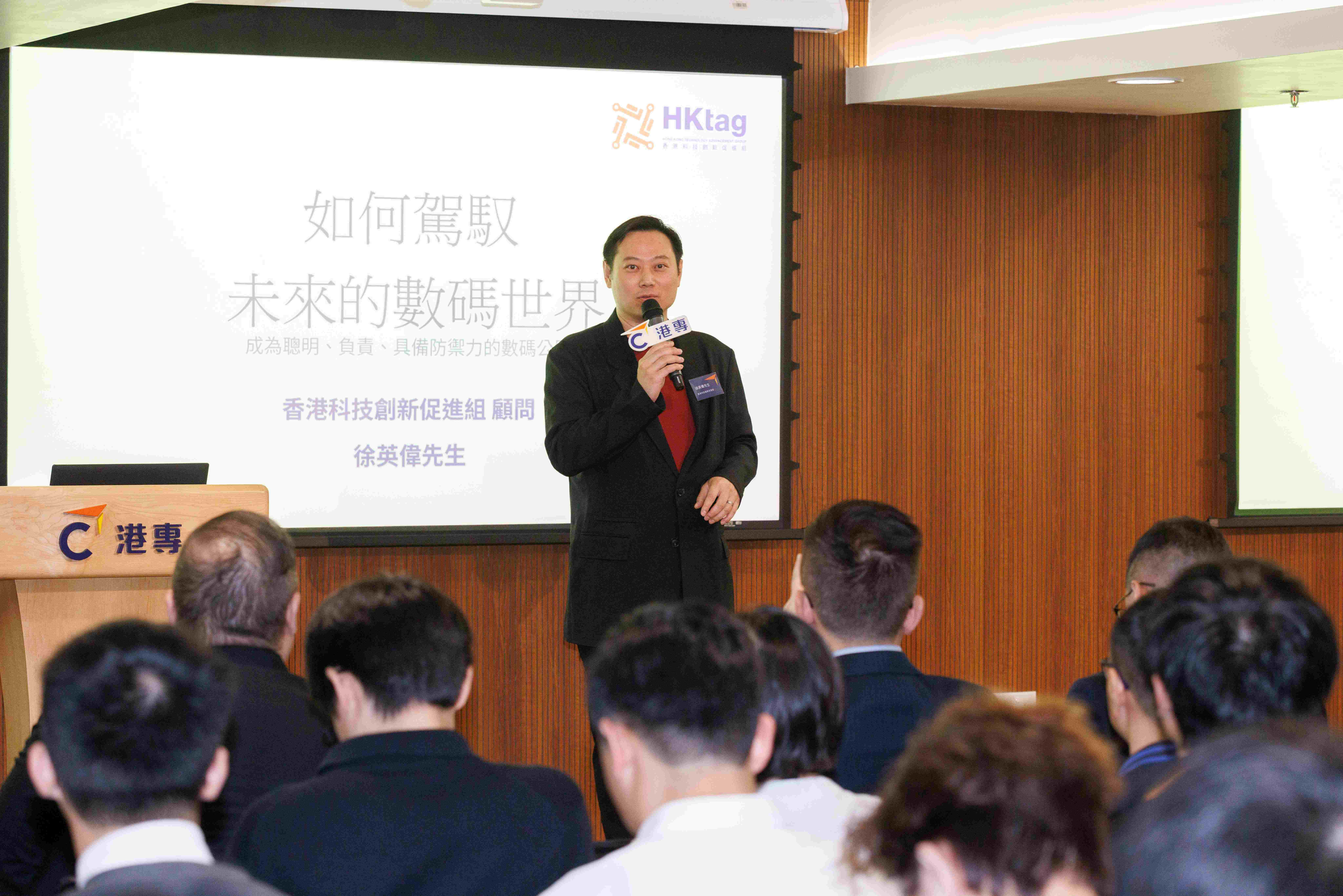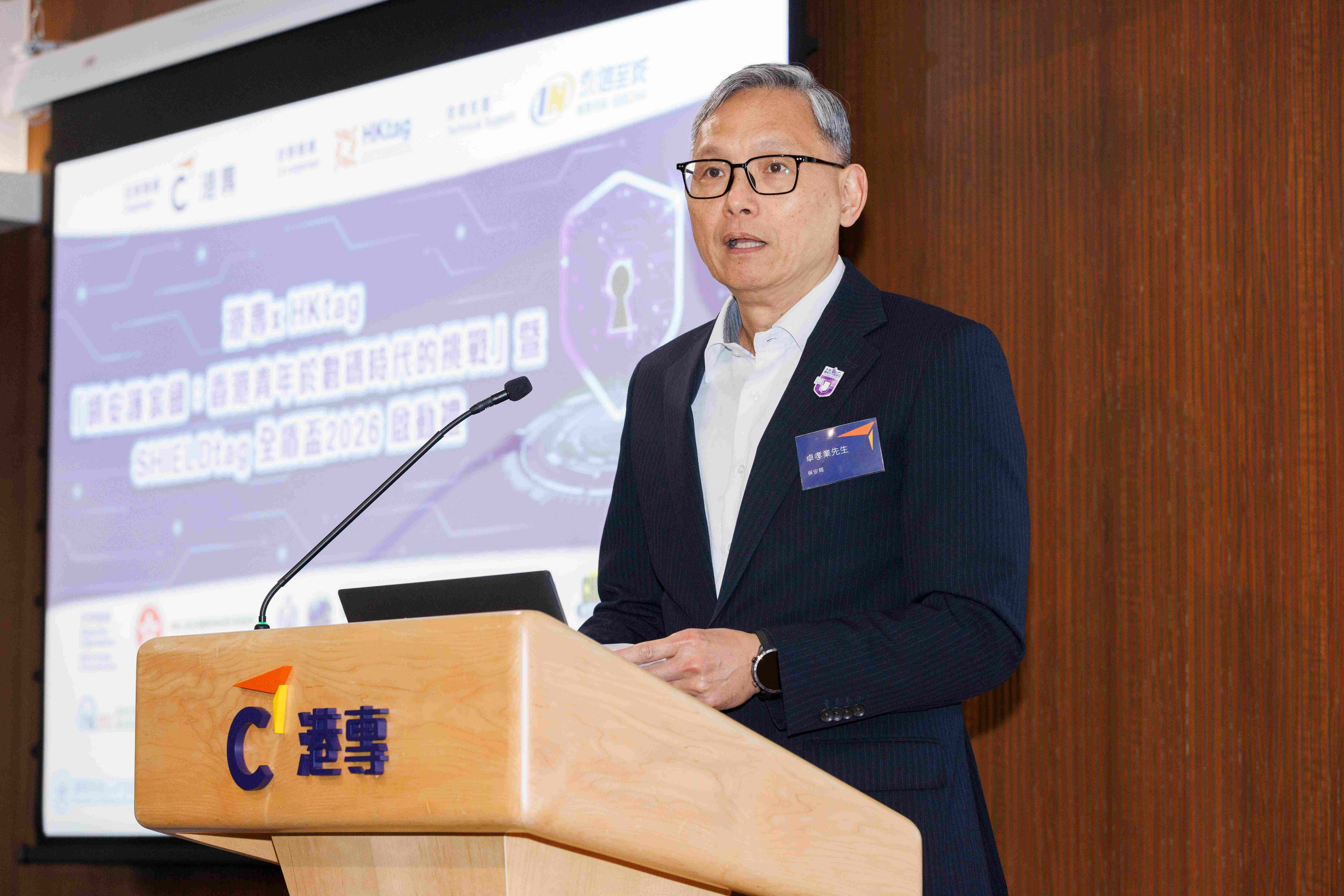 保安局副局長卓孝業先生在致辭時表示,網絡安全是國家安全的重要組成部分,亦與市民的日常生活息息相關。當年輕人懂得分辨網絡陷阱、保護個人私隱,已是在為整體網絡安全作出貢獻。他肯定港專與HKtag將網絡安全教育延伸至中學層面的跨界合作,並鼓勵學生由認知走向實踐,培養正確的網絡安全觀念。