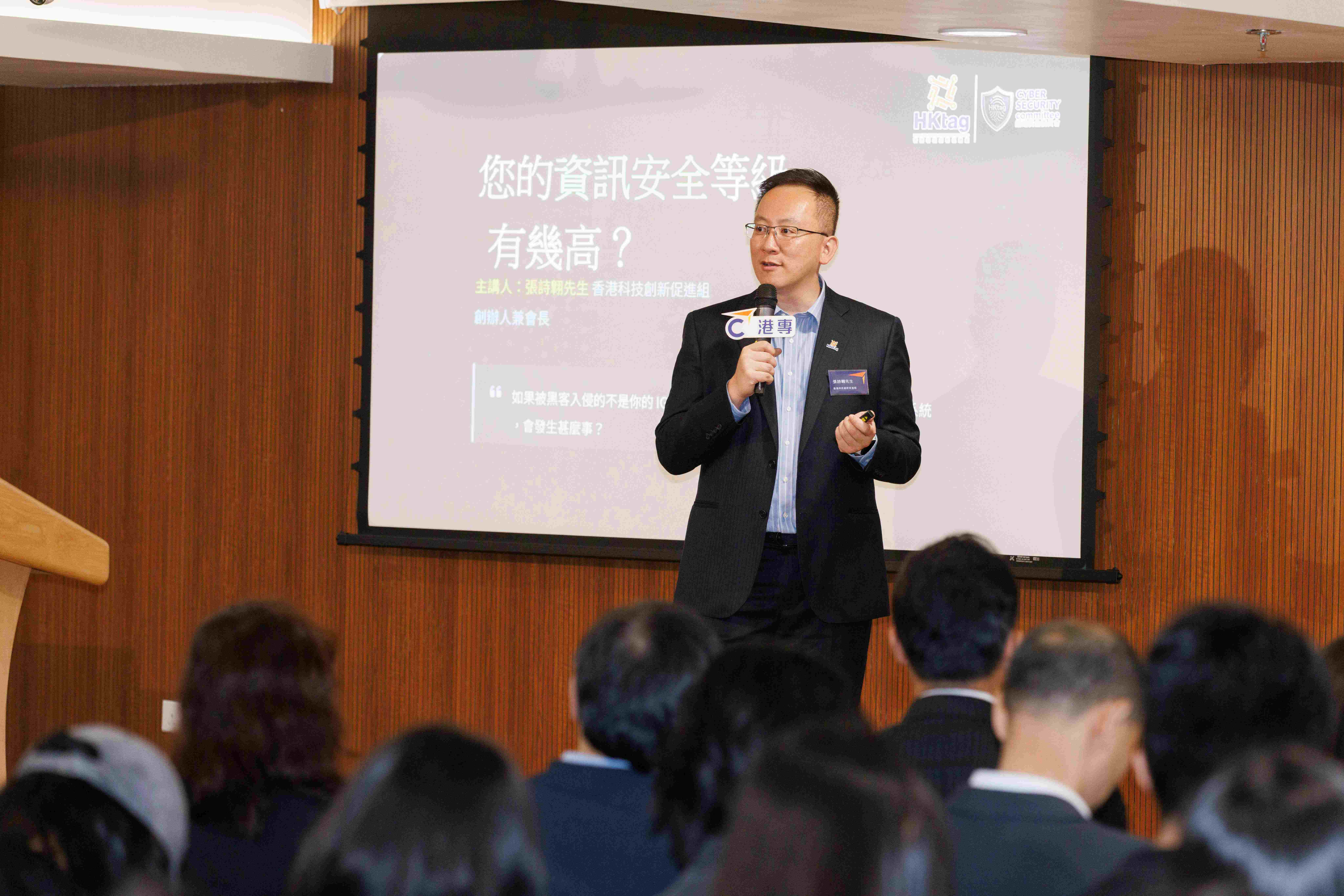 香港科技創新促進組創辦人兼會長張詩翱先生則透過「你的資訊安全等級有幾高?」的分享,指出「個人的資訊安全意識與整體社會甚至國家安全息息相關,網絡安全已經是保護社會、甚至國家安全的第一道防線。」他介紹道,「全盾盃」透過合法、安全的奪旗賽環境,讓學生在實戰中理解攻防思維,培養新一代網絡安全守護者。