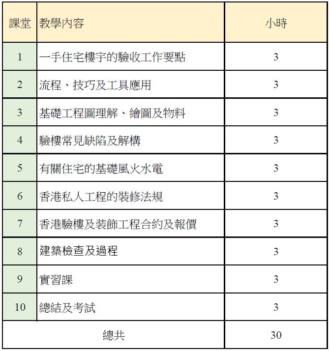 課程為有意投身驗樓及樓宇相關行業人士而設,內容涵蓋住宅樓宇的檢驗指引及注意事項、最新驗樓有關的科技、基礎室內裝修知識、基礎風火水電知識,住宅驗樓相關法律知識。課程由【香港驗樓師學會】委派資深導師任教,並分享過往經驗及行內標準。課程更設有實習課堂,學員可透過實習課認識檢驗樓宇的程序和要訣,以及掌握驗樓工具和儀器的應用技巧,使學員能具備必要的樓宇檢驗知識及實務技巧,以便投身為樓宇檢驗人員或應用在相關工作上。